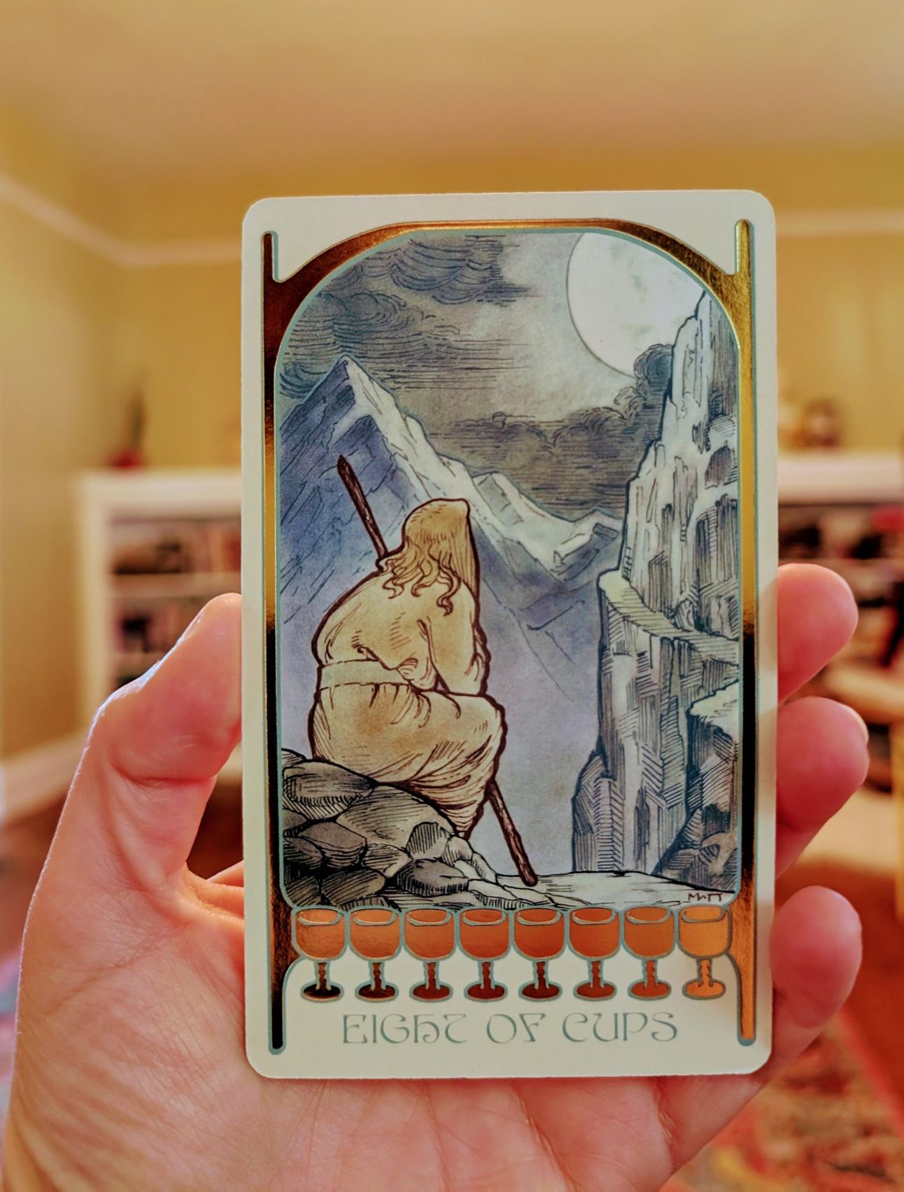 The Eight of Cups in a Tarot reading signals a time to let go of situations that no longer serve your well-being, even if it means leaving behind something familiar or once cherished.